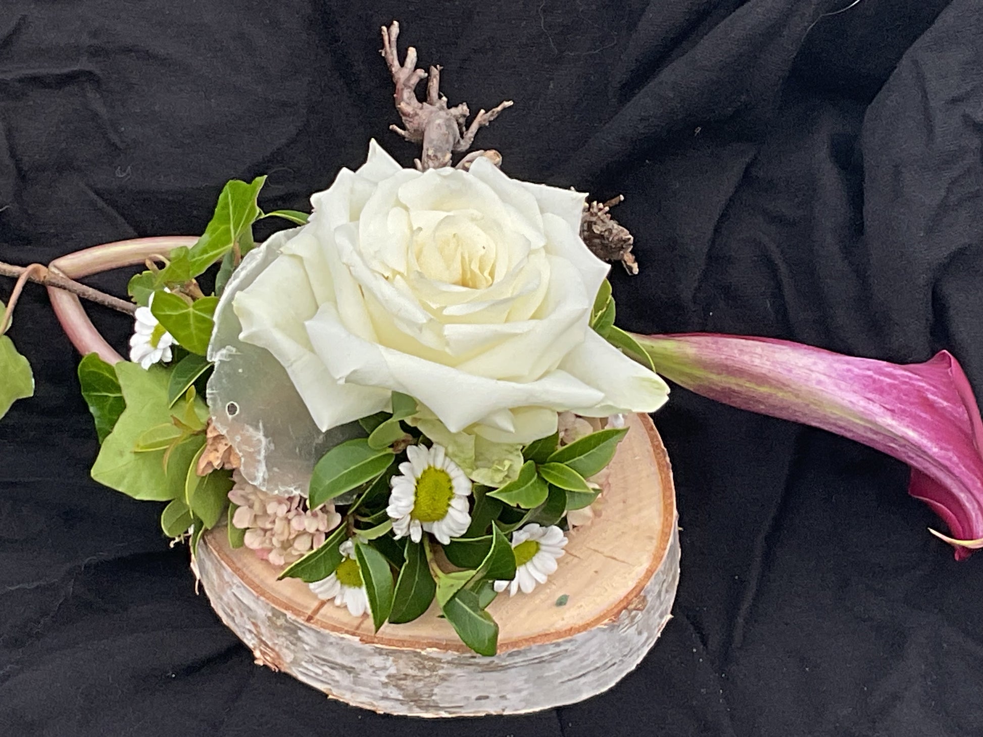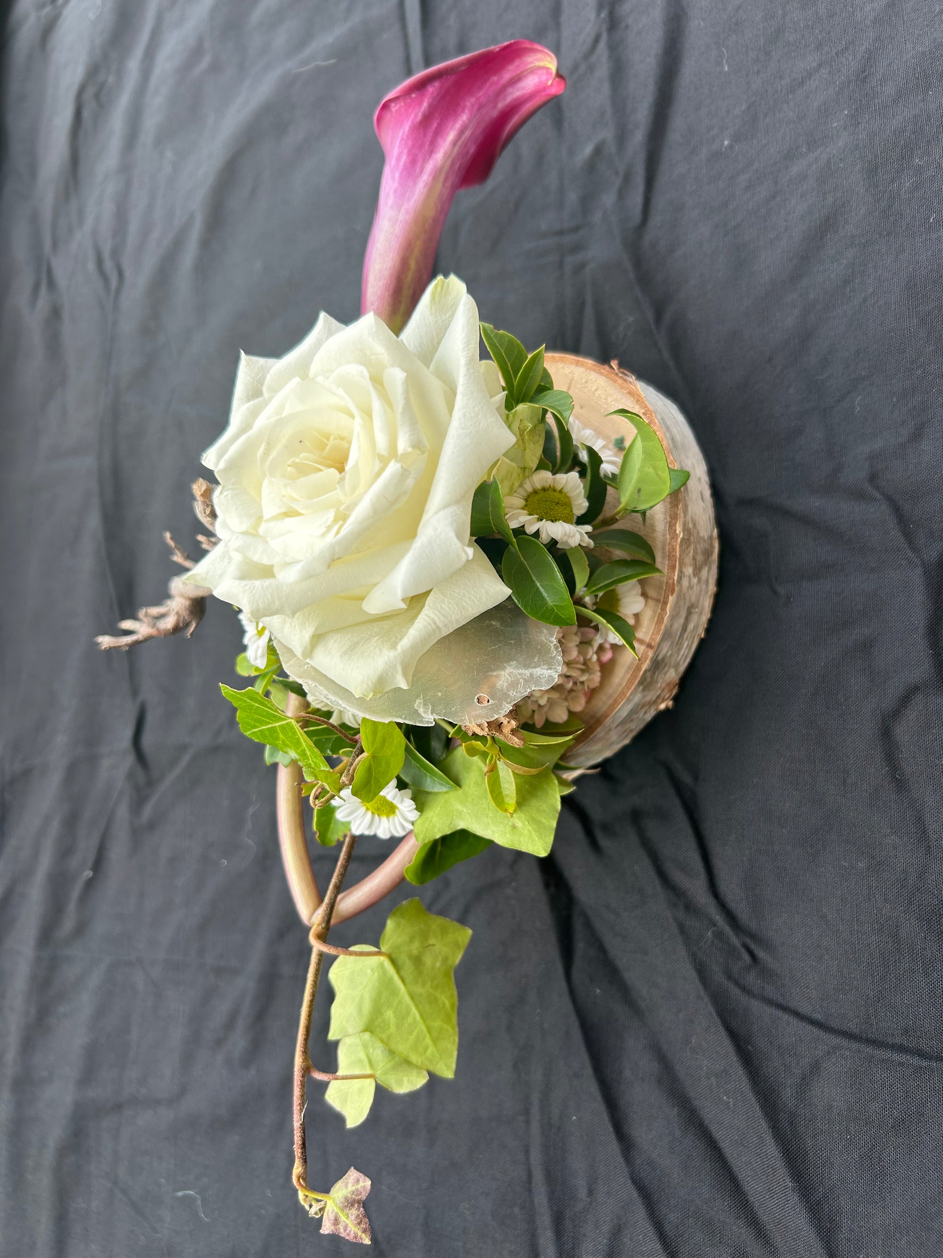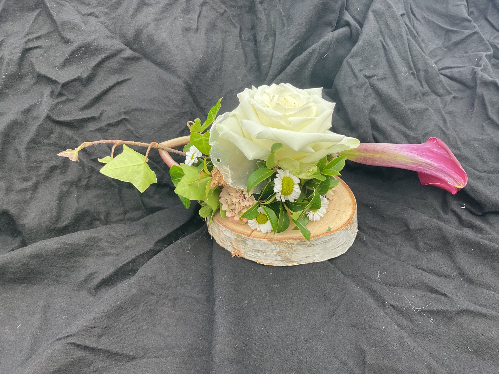 Dit kleinste grafstuk is ideaal voor een urn. Het is gemaakt op een berkenring. De houtschijf heeft een doorsnede van 14 cm