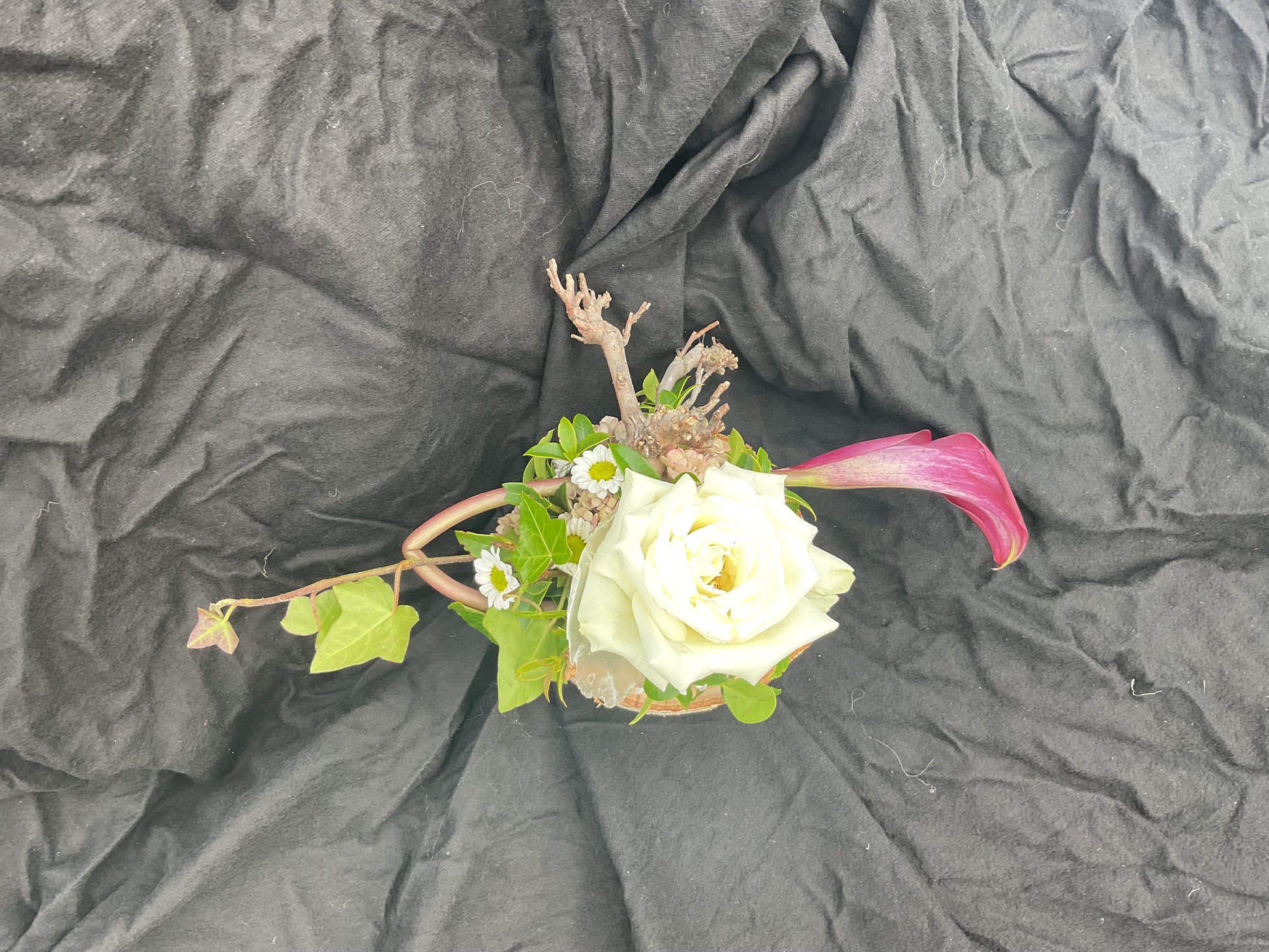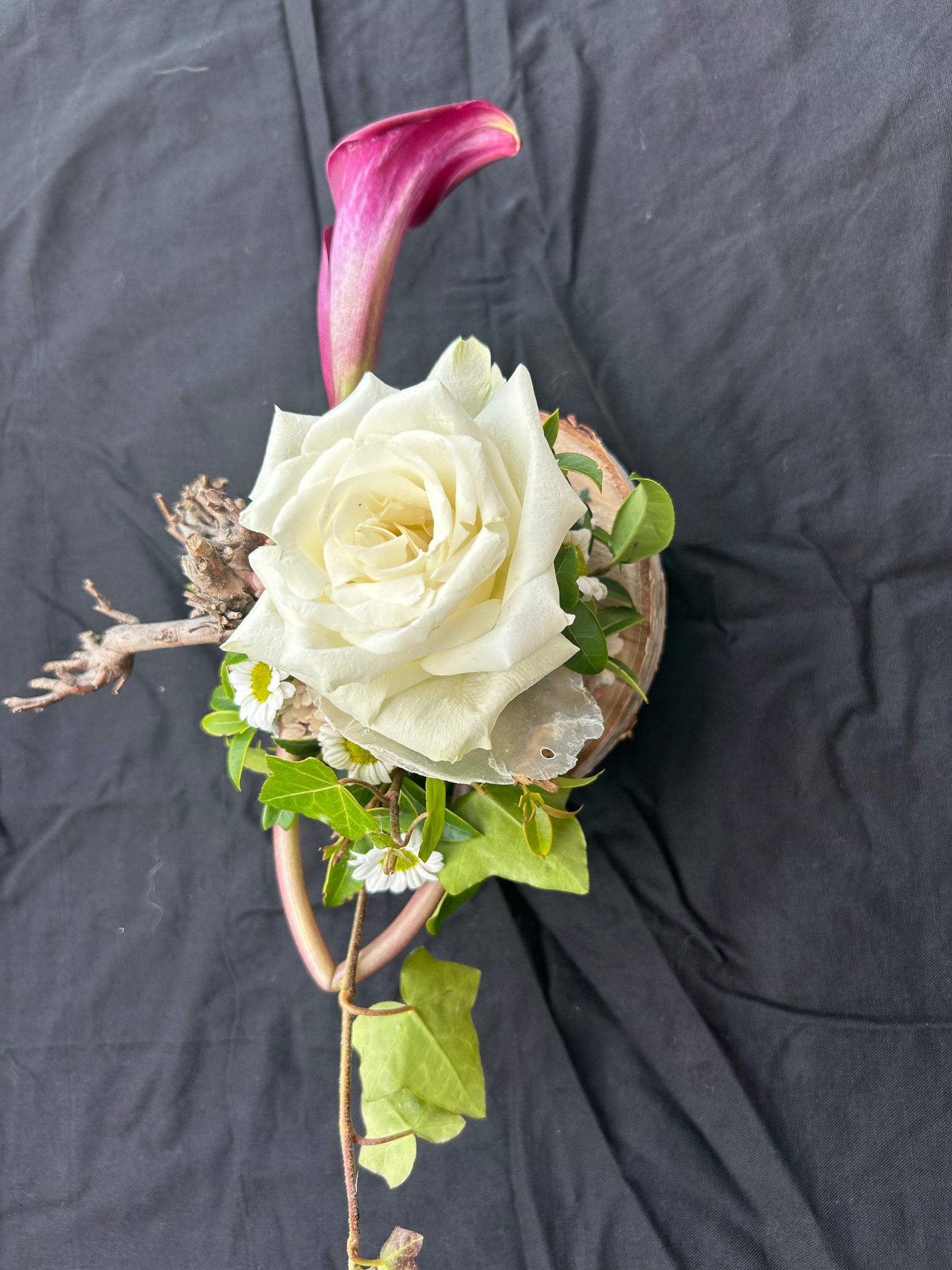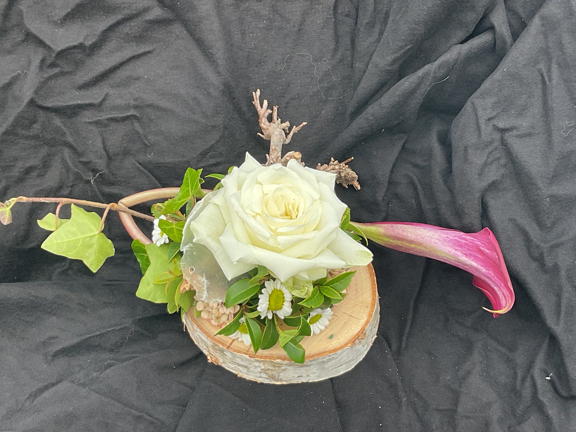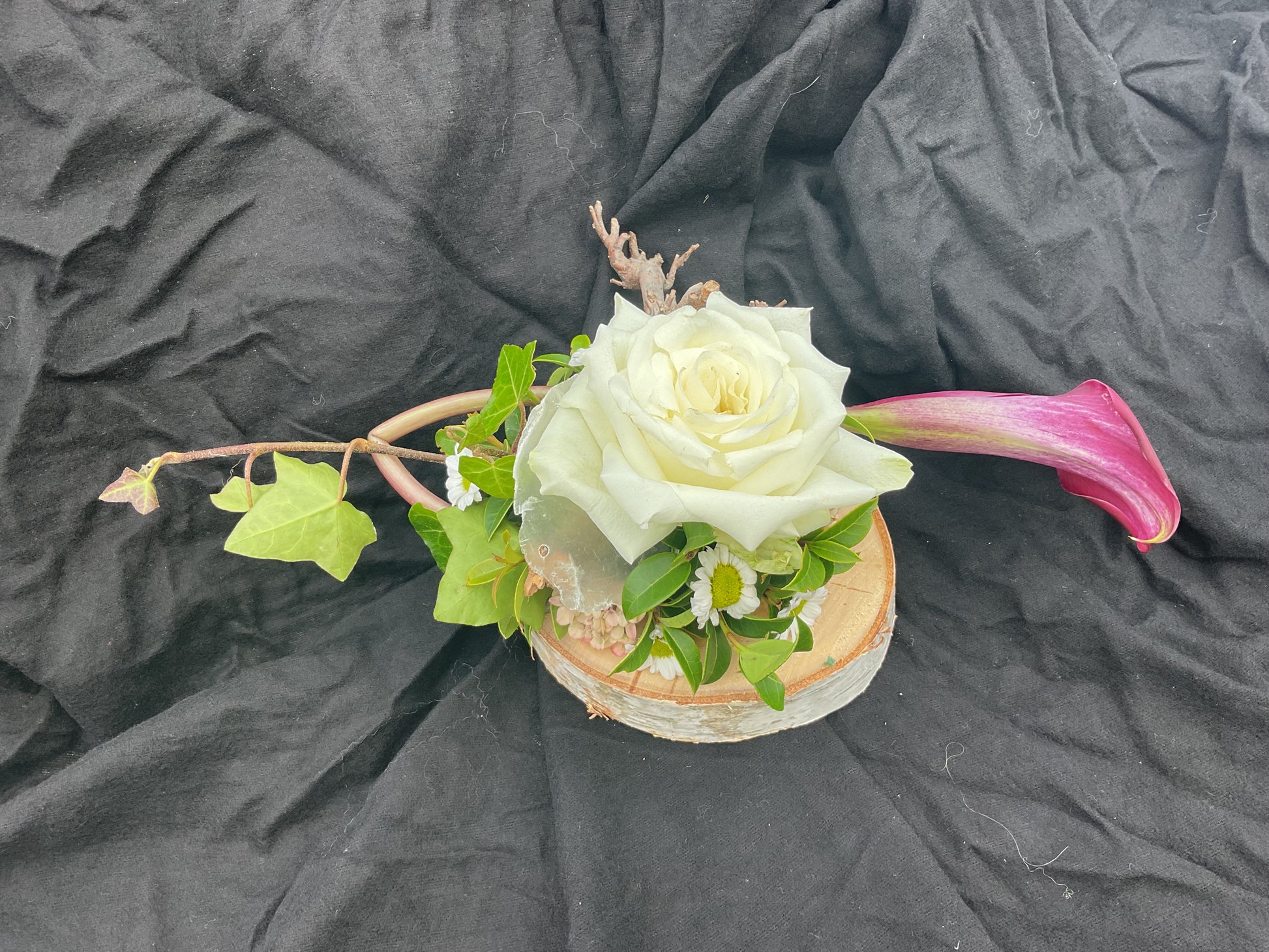 Dit kleinste grafstuk is ideaal voor een urn. Het is gemaakt op een berkenring. De houtschijf heeft een doorsnede van 14 cm