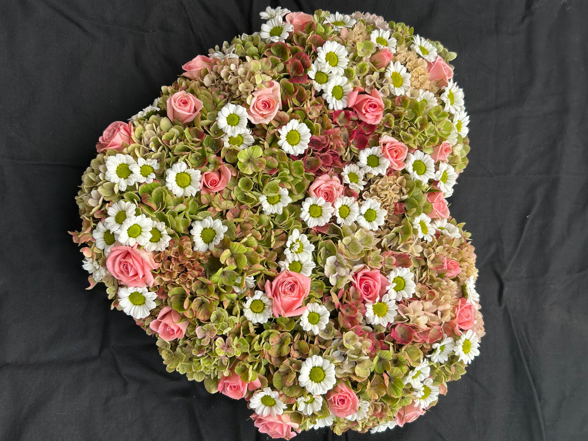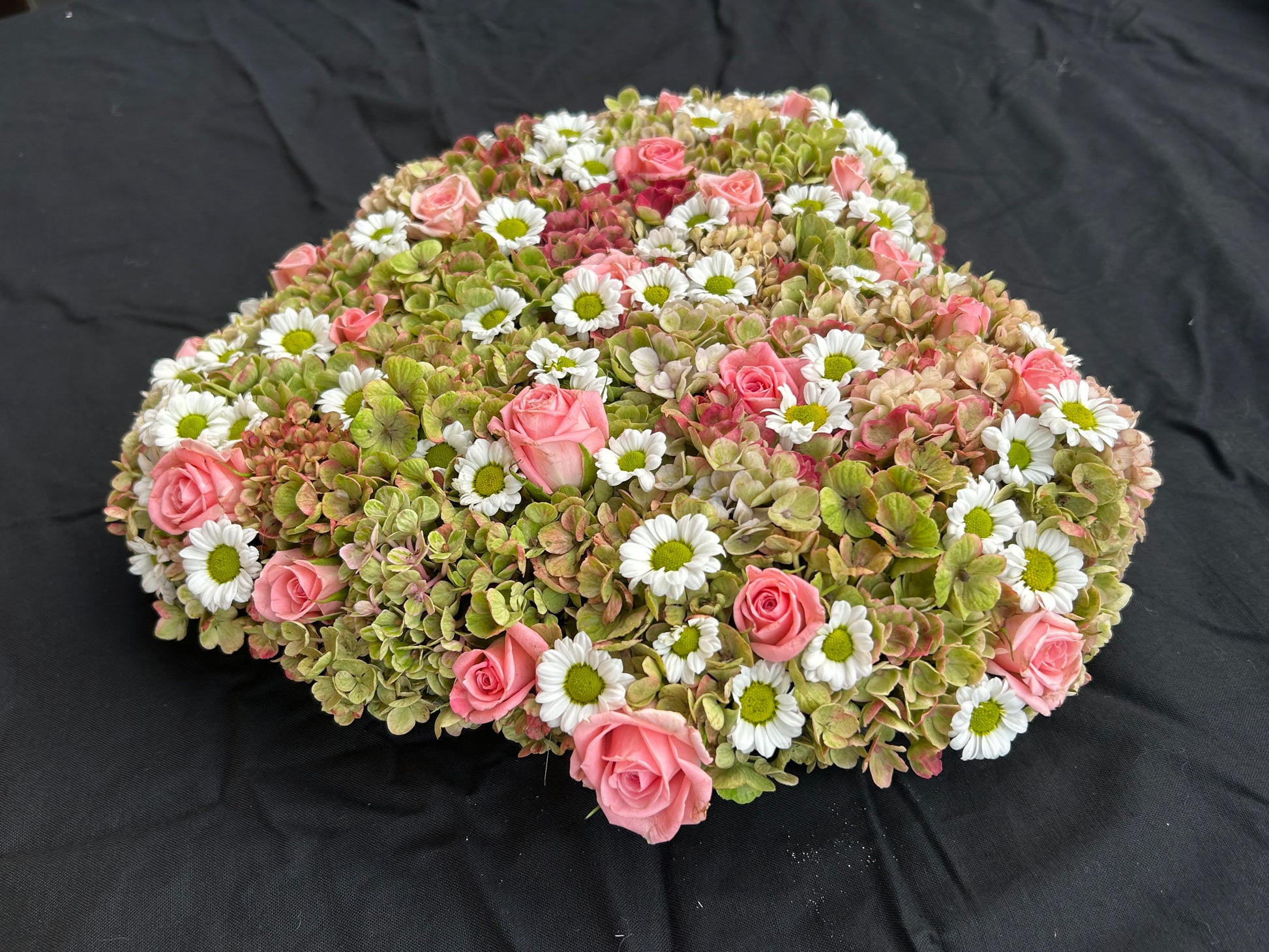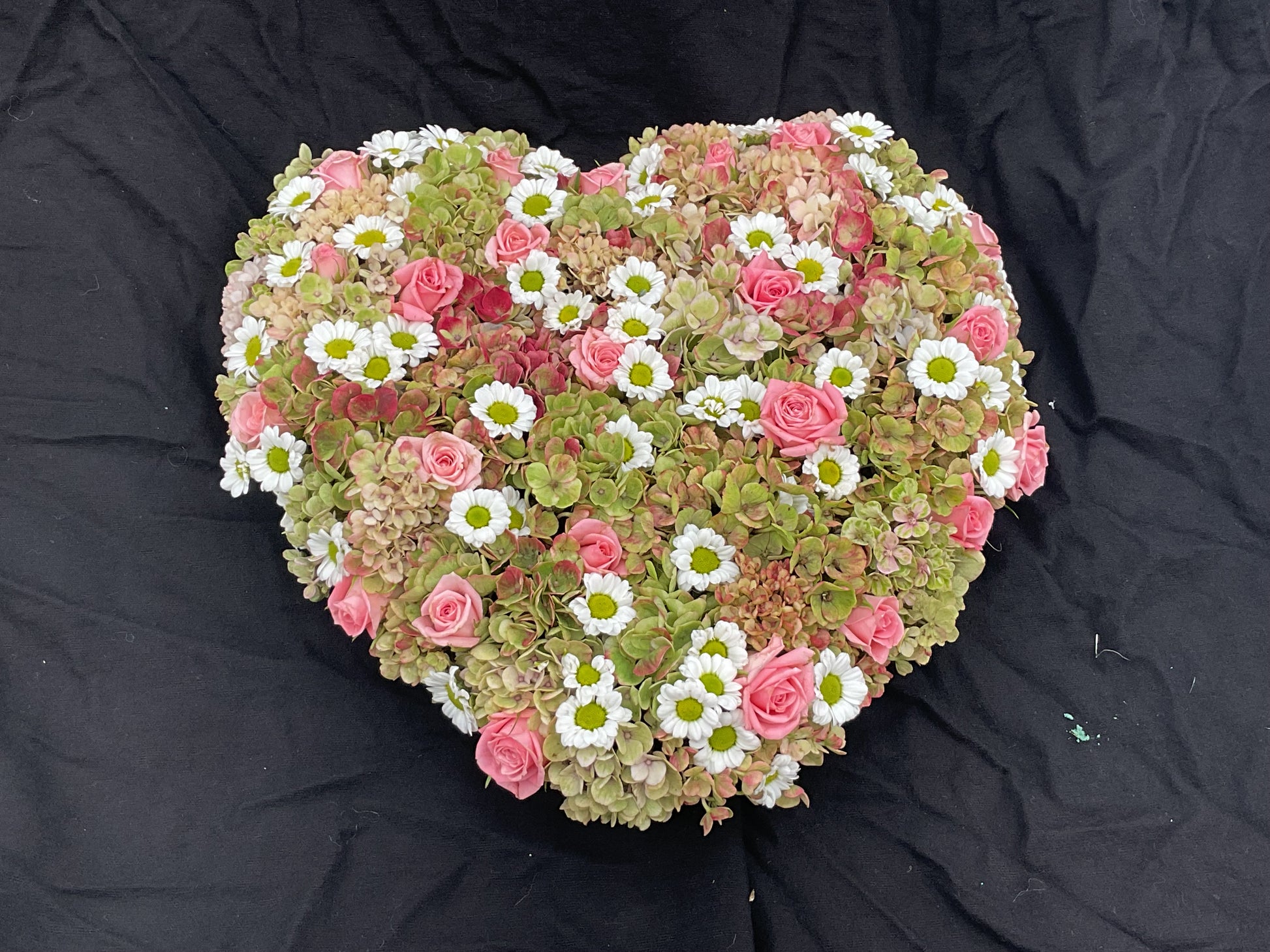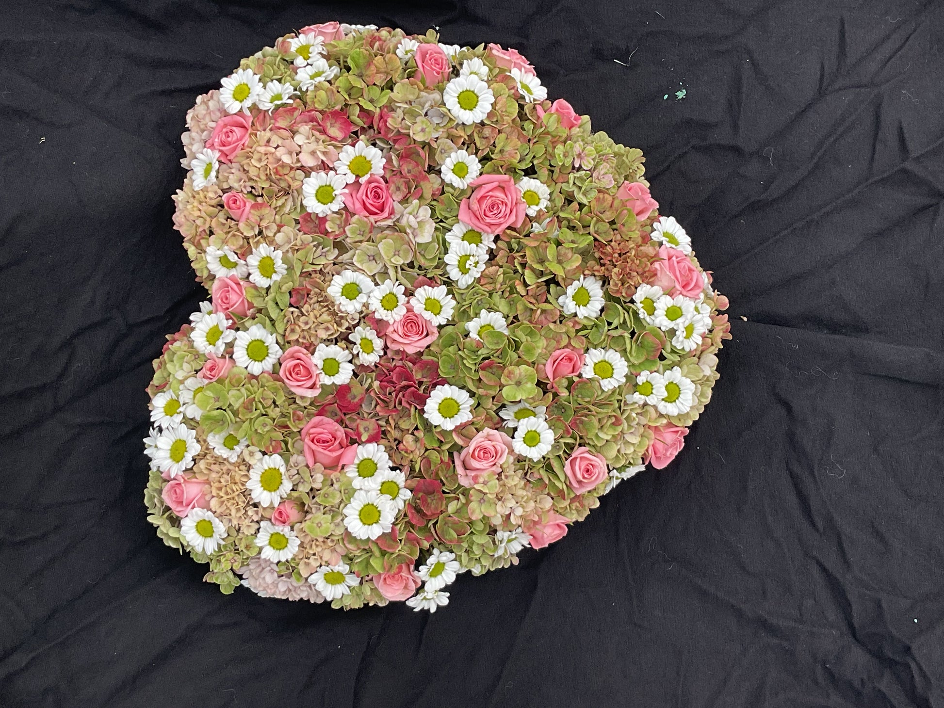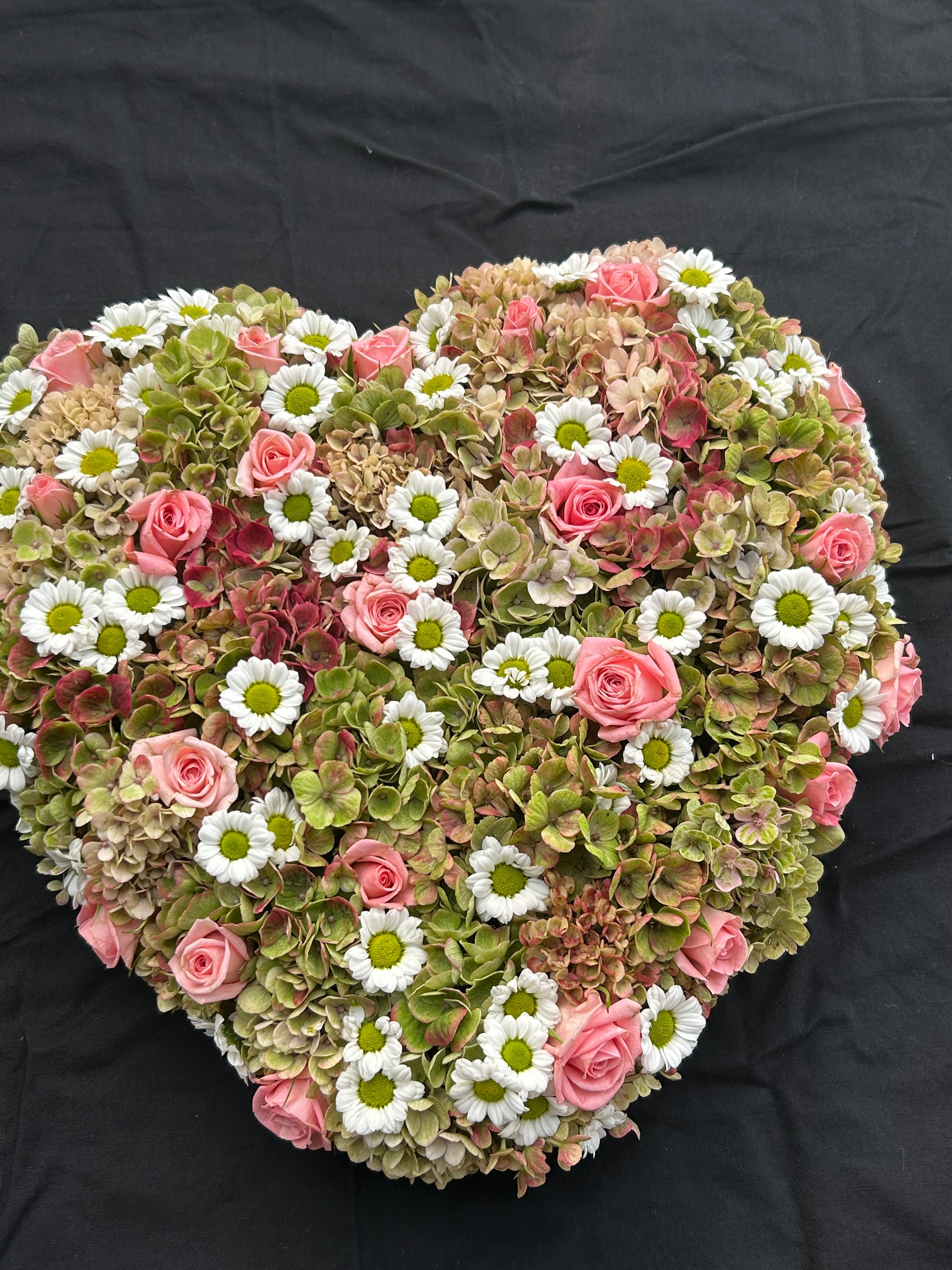 Dit strak stuk is gemaakt op een oasishart . Het hart heeft een lengte van 30 cm en een breedte van 26 cm