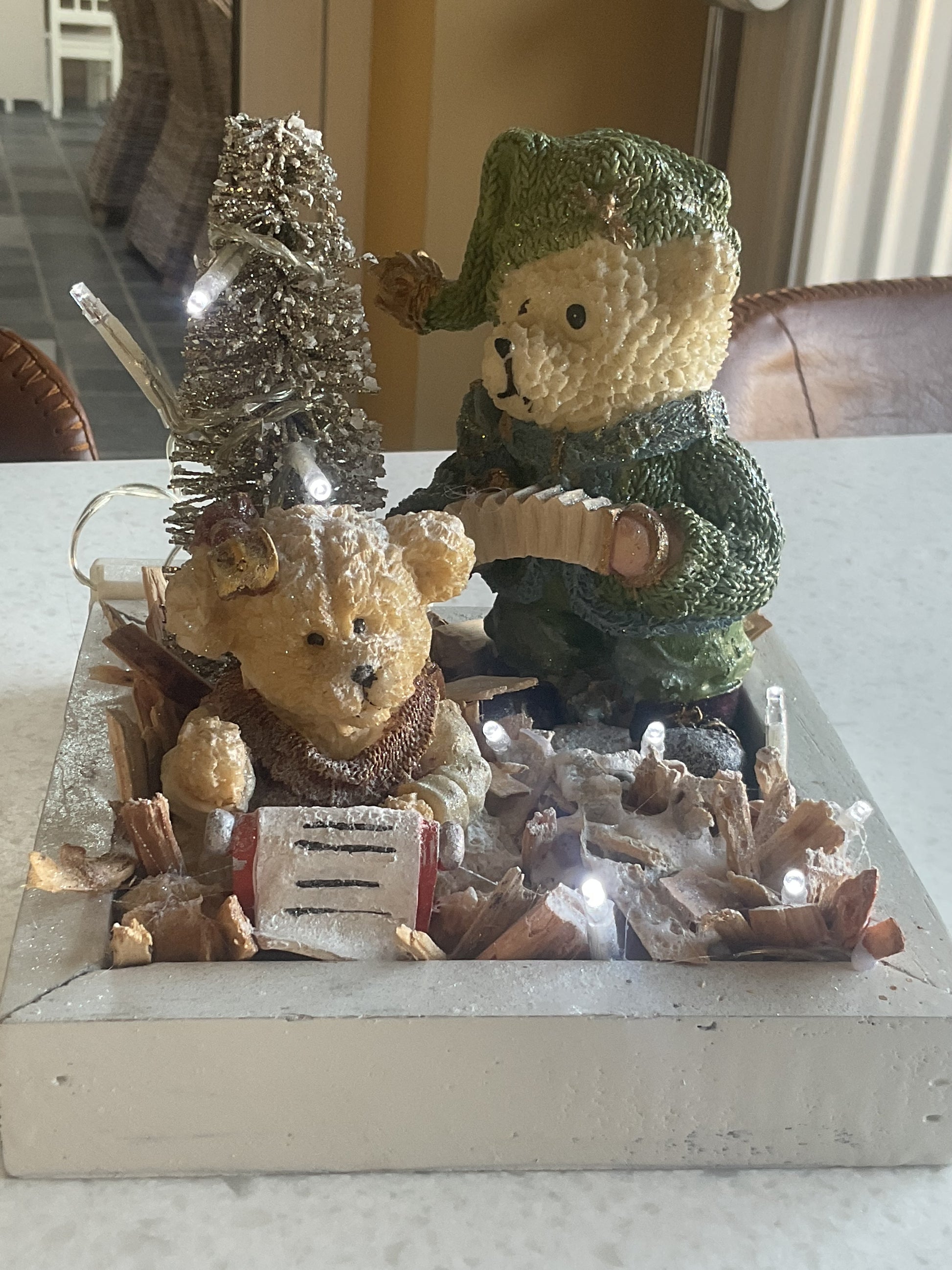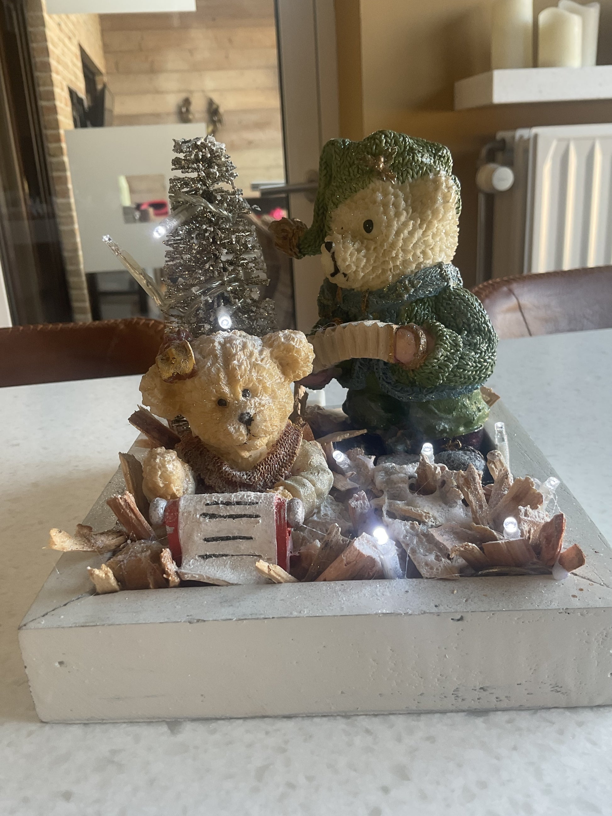 Kerststuk van 15 cm op 15 cm en een hoogte van 15 cm dat verlicht wordt met batterijen