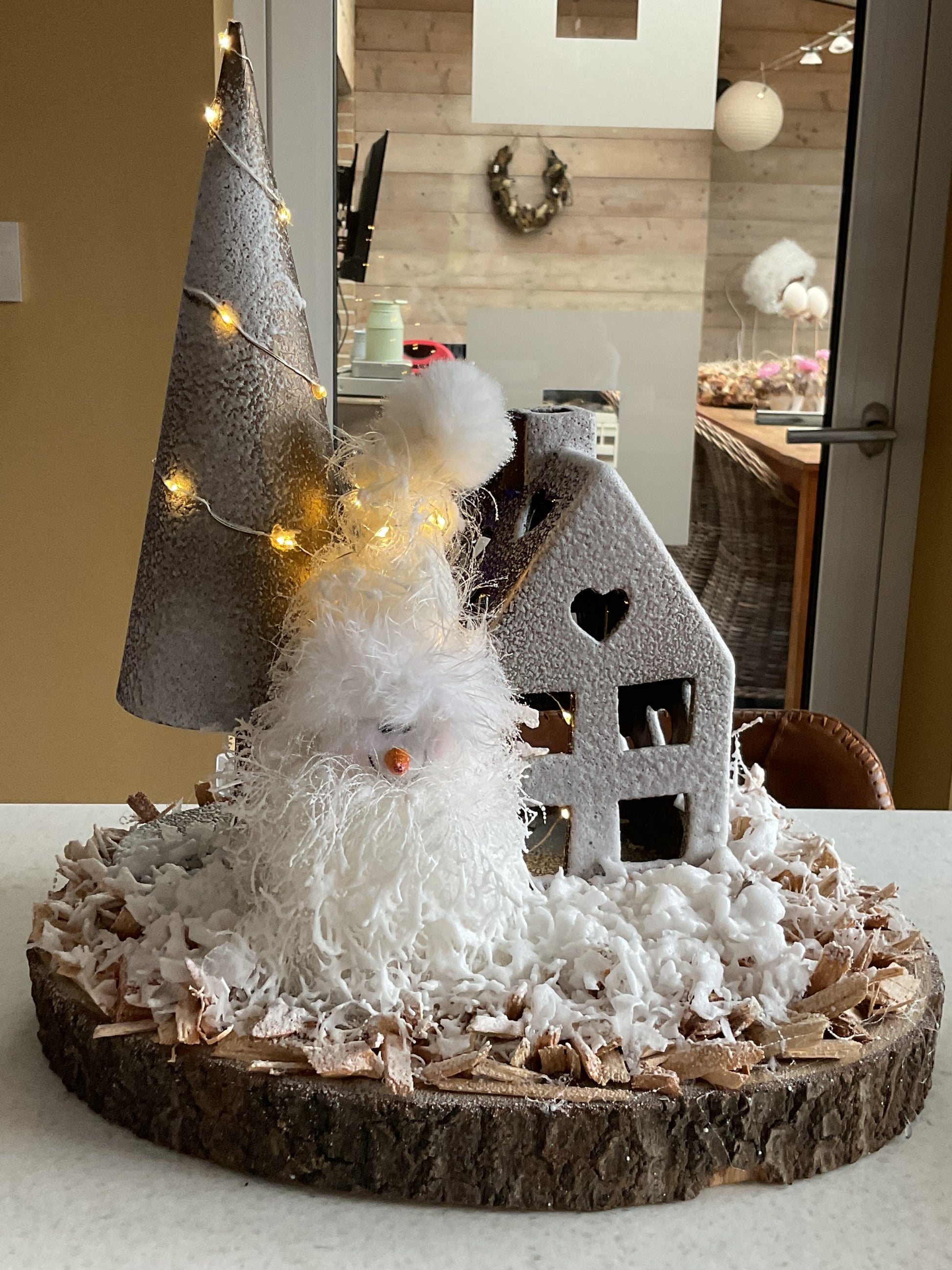 Groot landschap dat verlicht wordt met lichtjes op batterijen. Het stuk is 36 cm lang, 32 cm diep en 40 cm hoog.