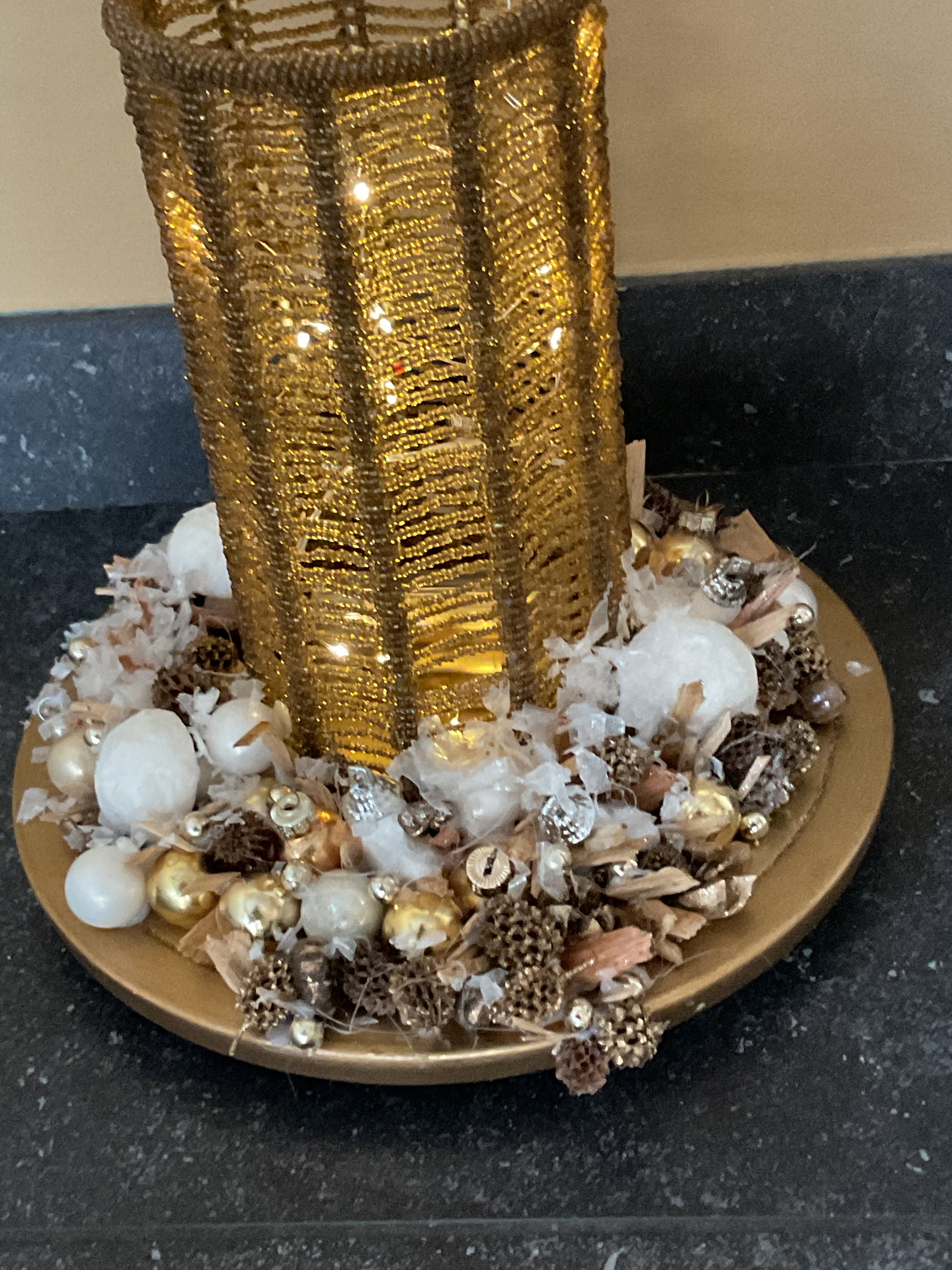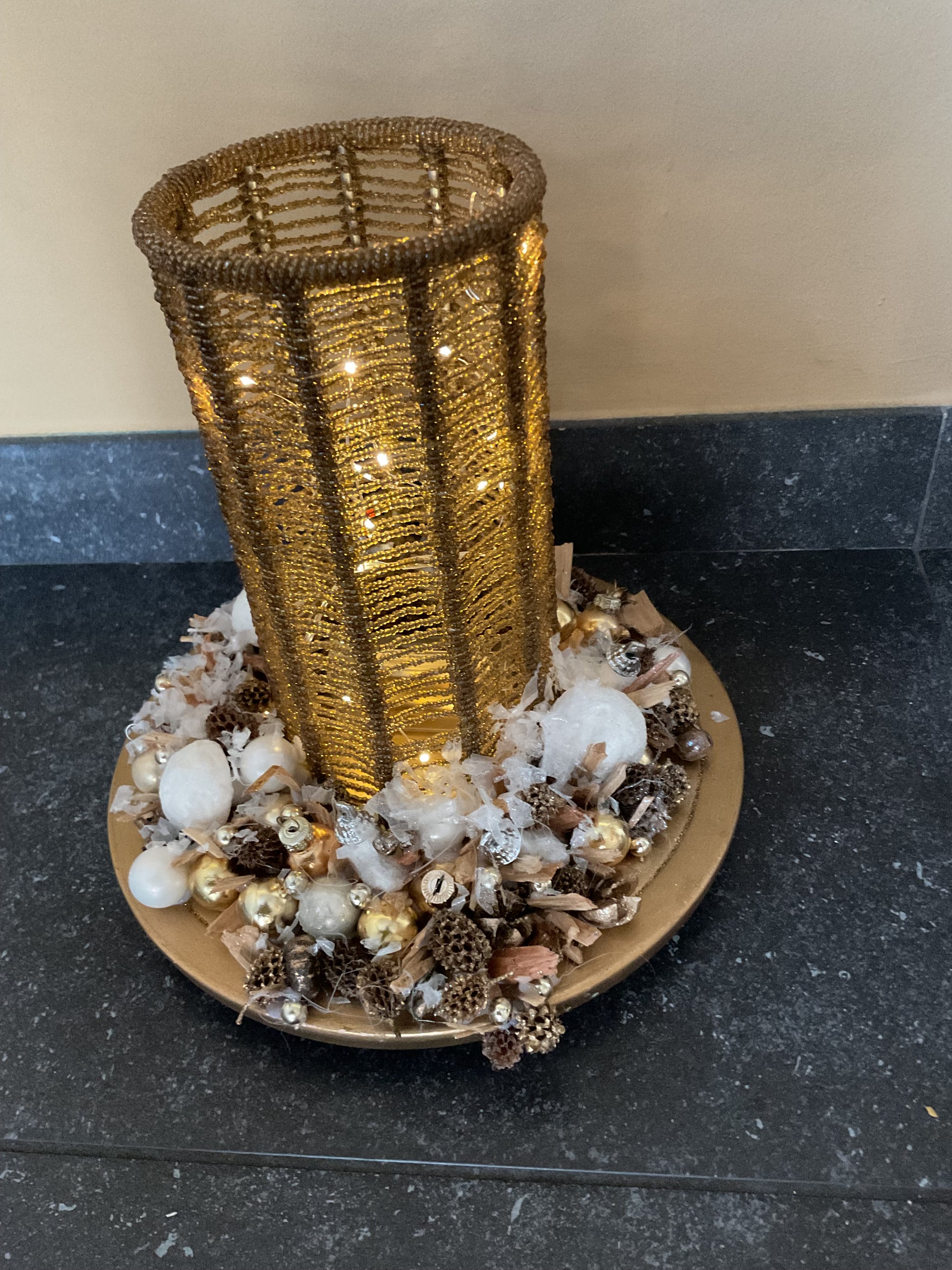 Verlicht stuk met batterijen met een hoogte van 23 cm en het grondvlak heeft een doorsnede van 20 cm
