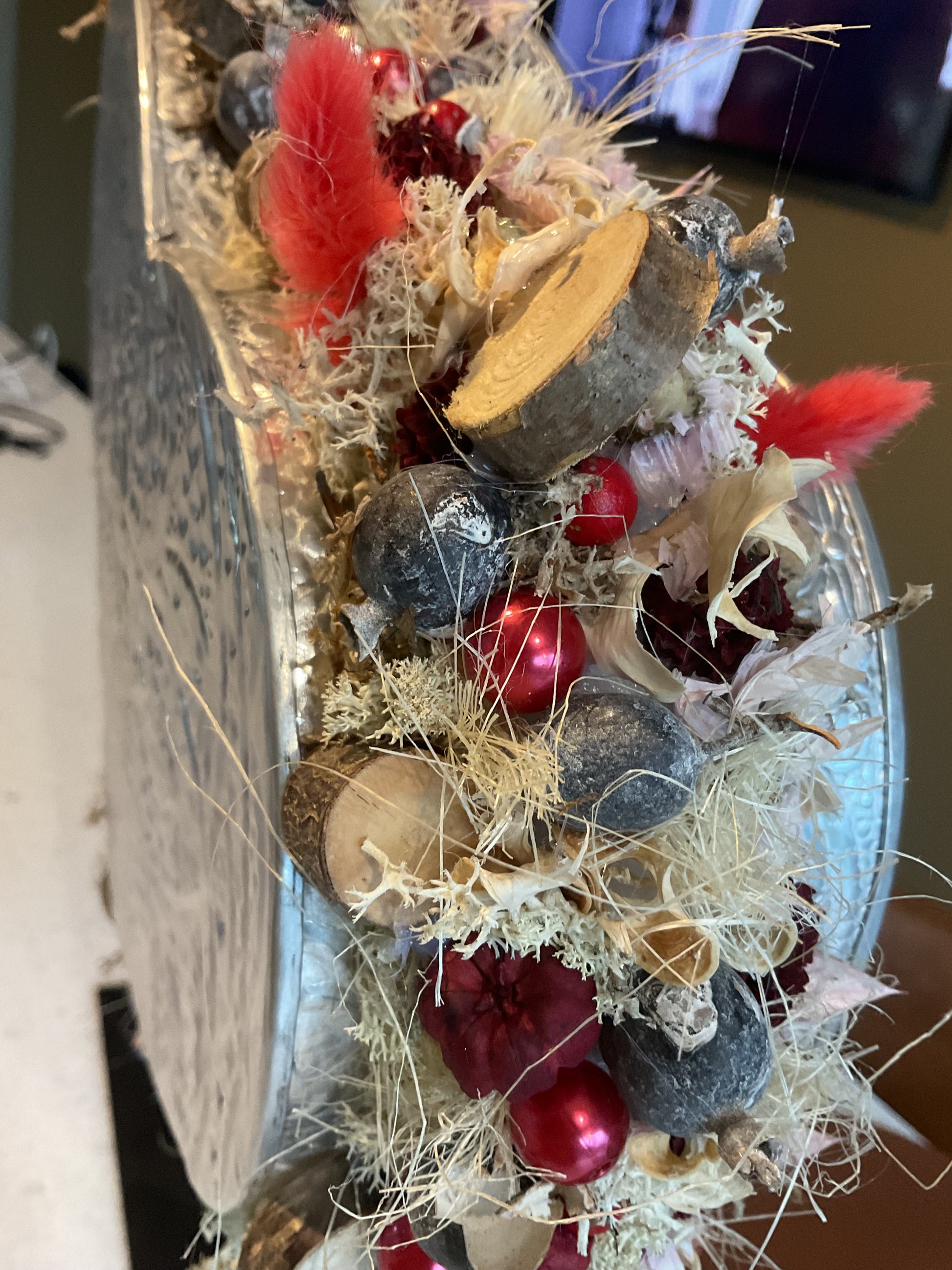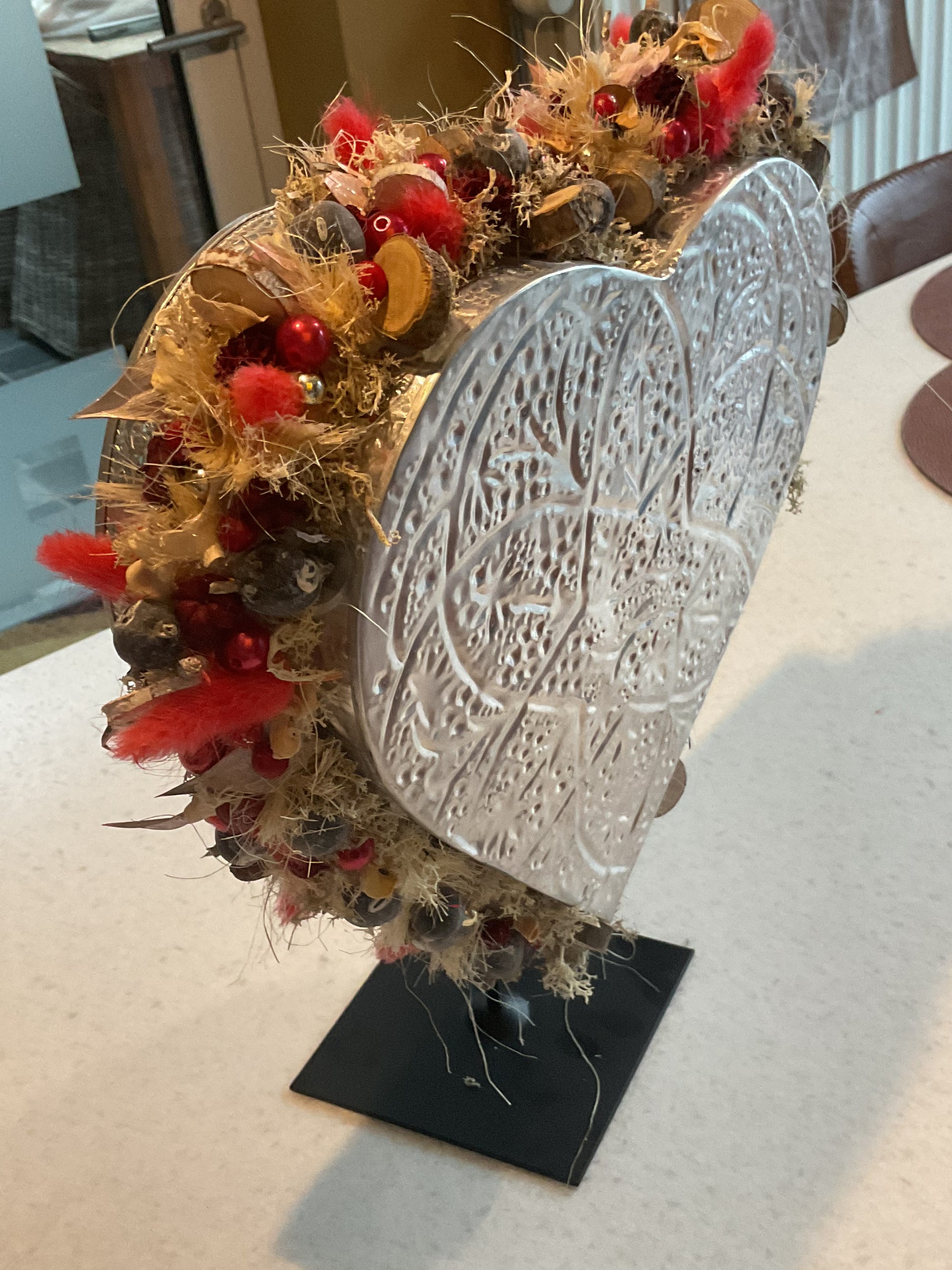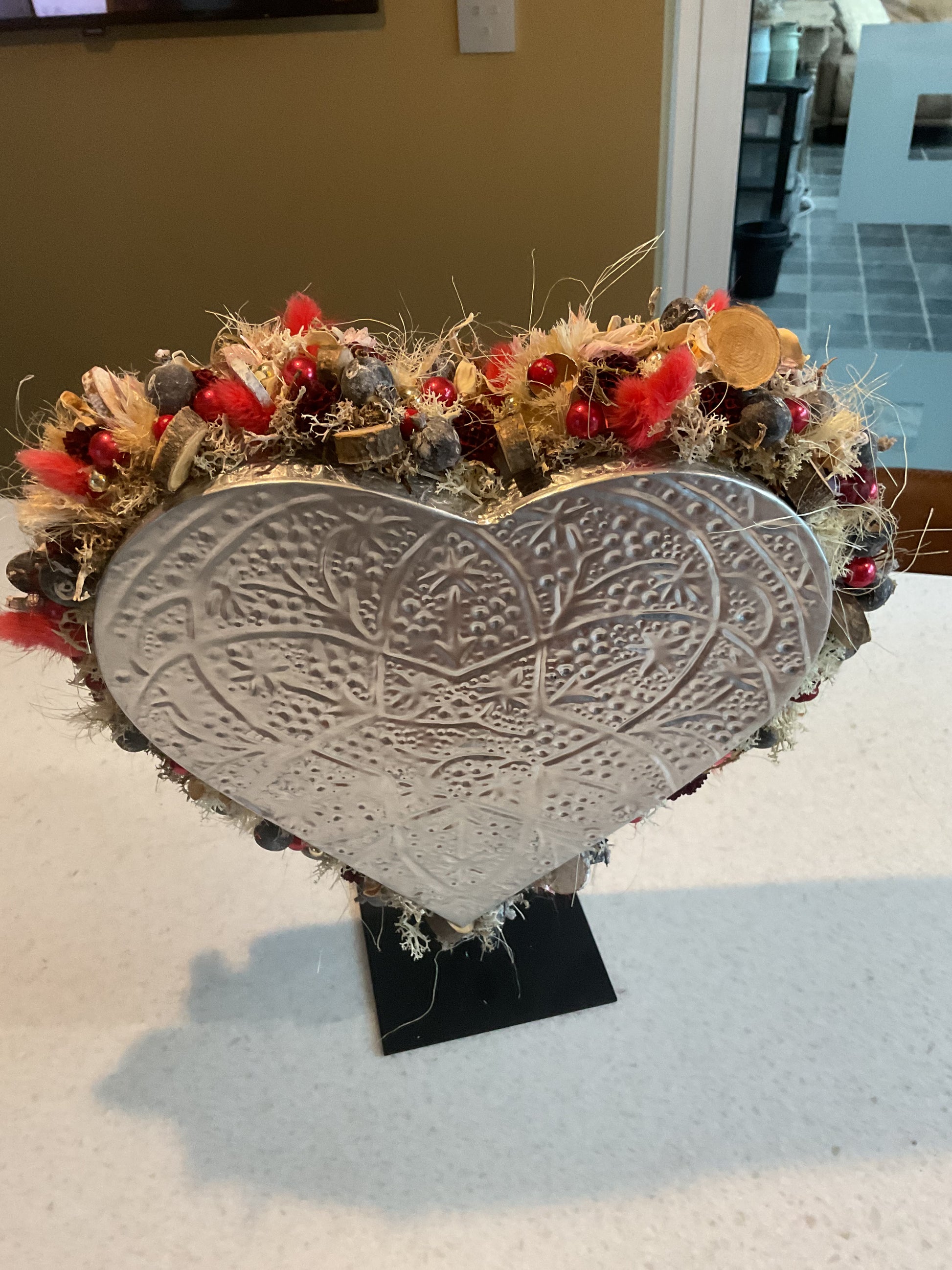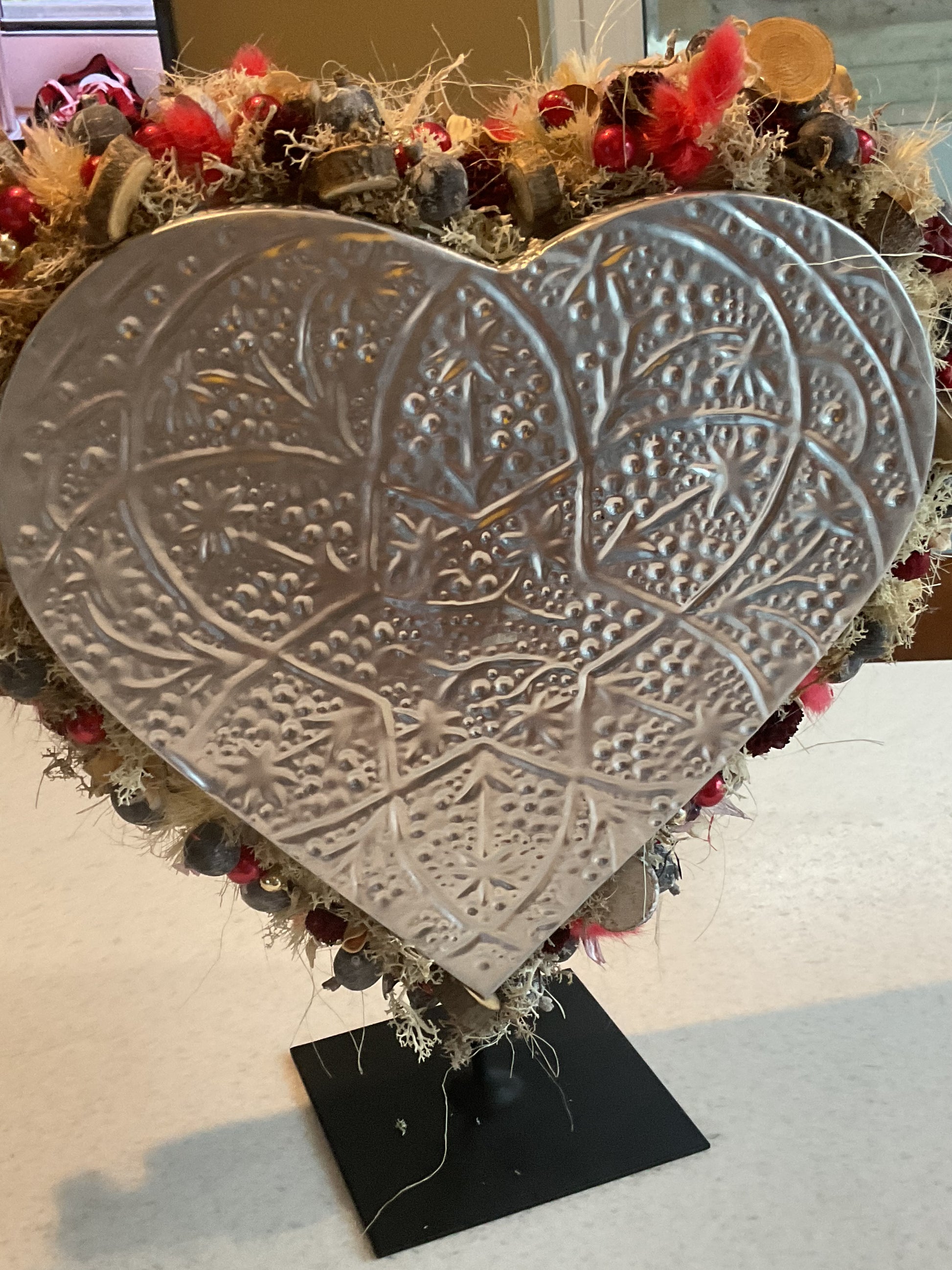 Metalen hart op een voet. De rand is versierd met natuurlijk materiaal. Het stuk is 40 cm hoog en 30 cm breed