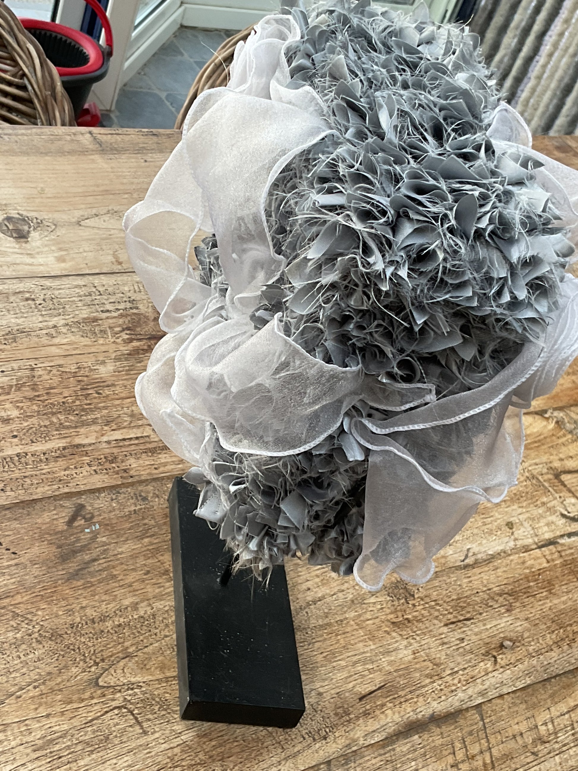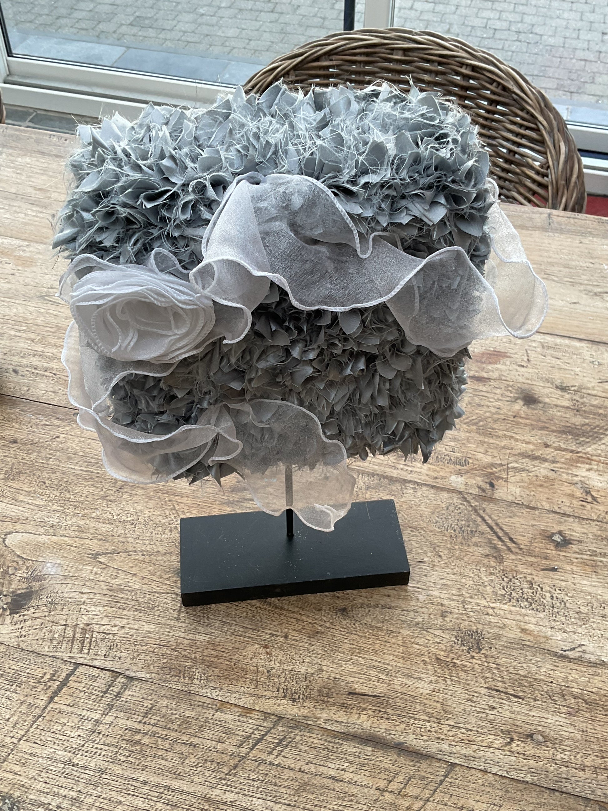 Stuk op een staander dat een totale hoogte heeft van 40 cm. Voor en achterkant zijn versierd met een bloem