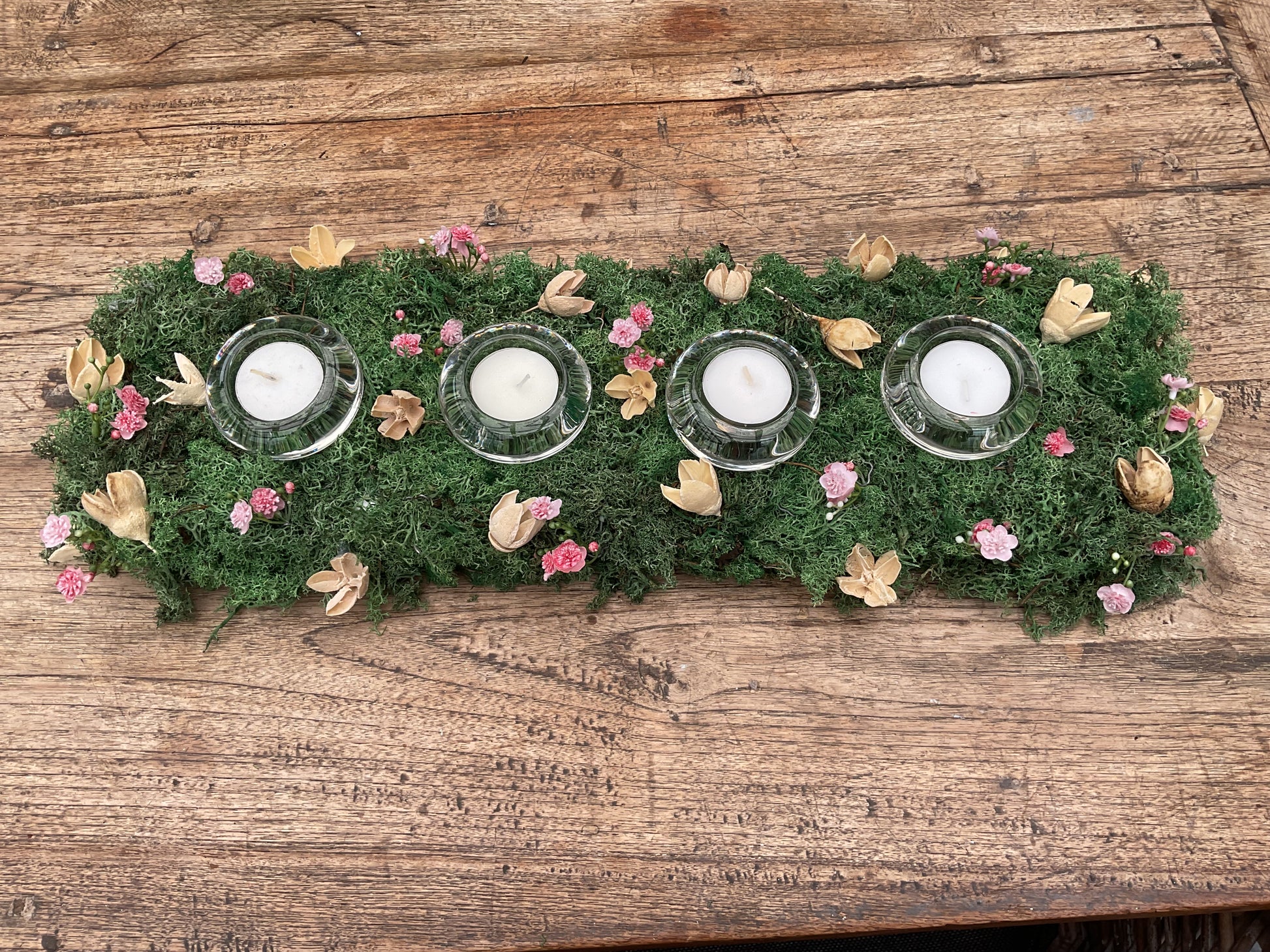 Tafelstuk van 50 cm op 15 cm gevuld met 4 kaarsen