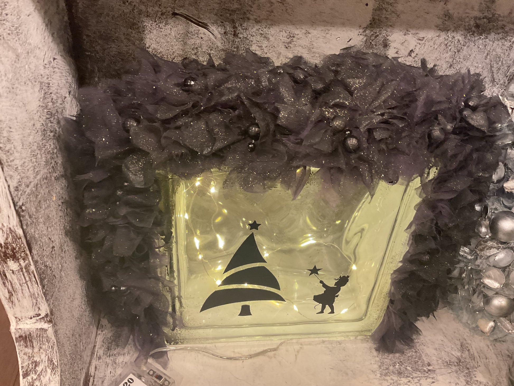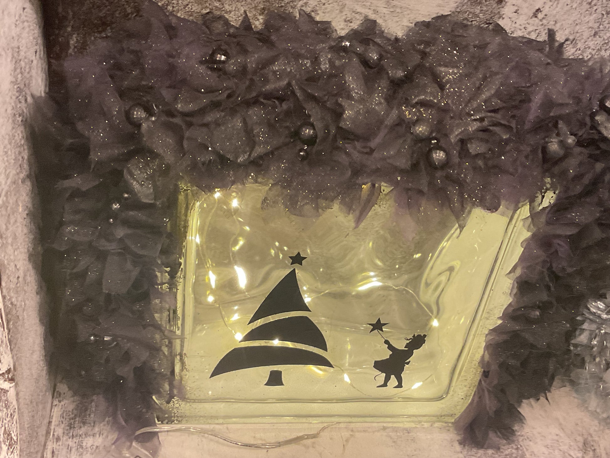 Glasdal met lichtjes op batterijen van 20 cm op 20 cm met zwarte glitterrand en op de voorgrond een engeltje en kerstboom