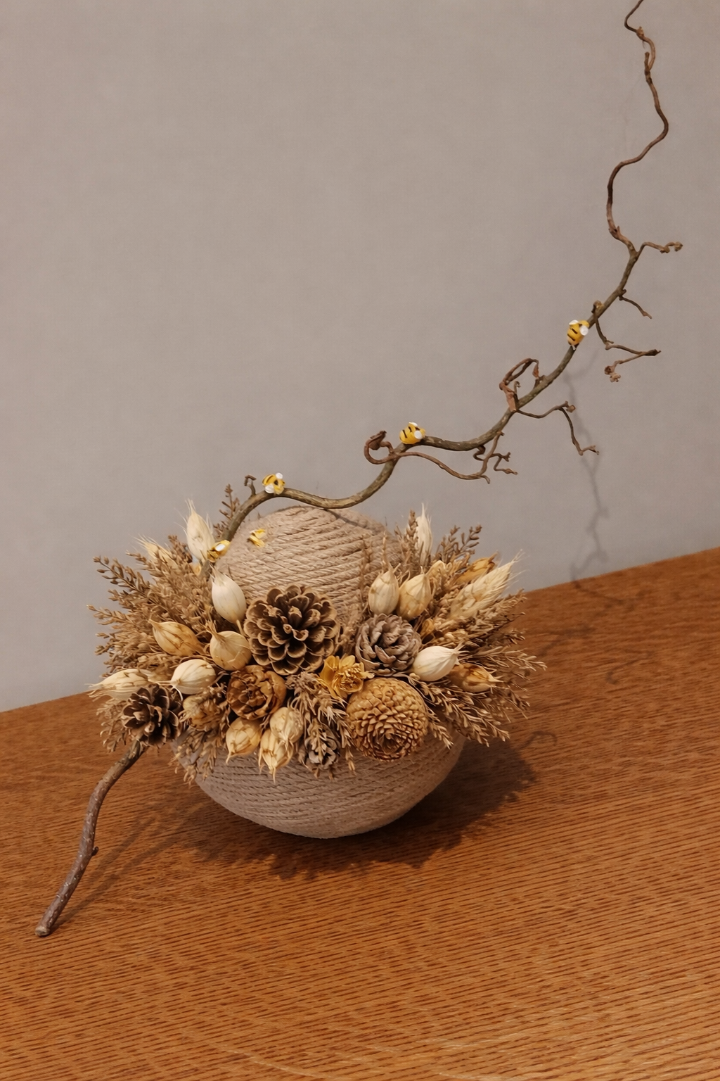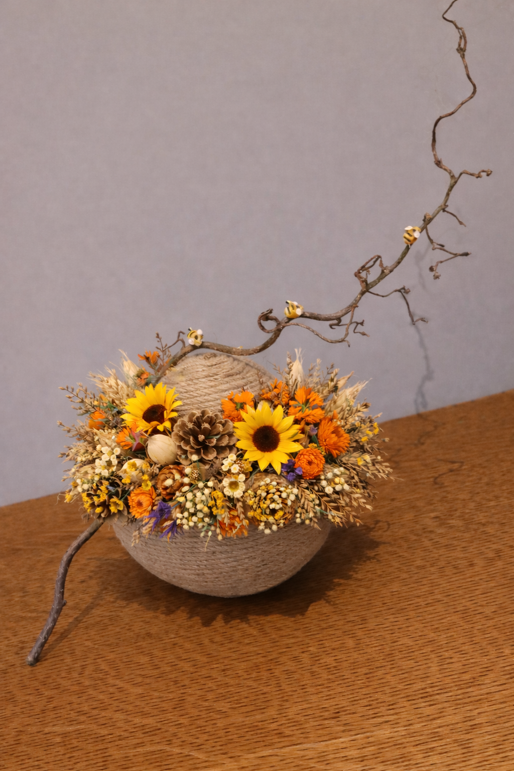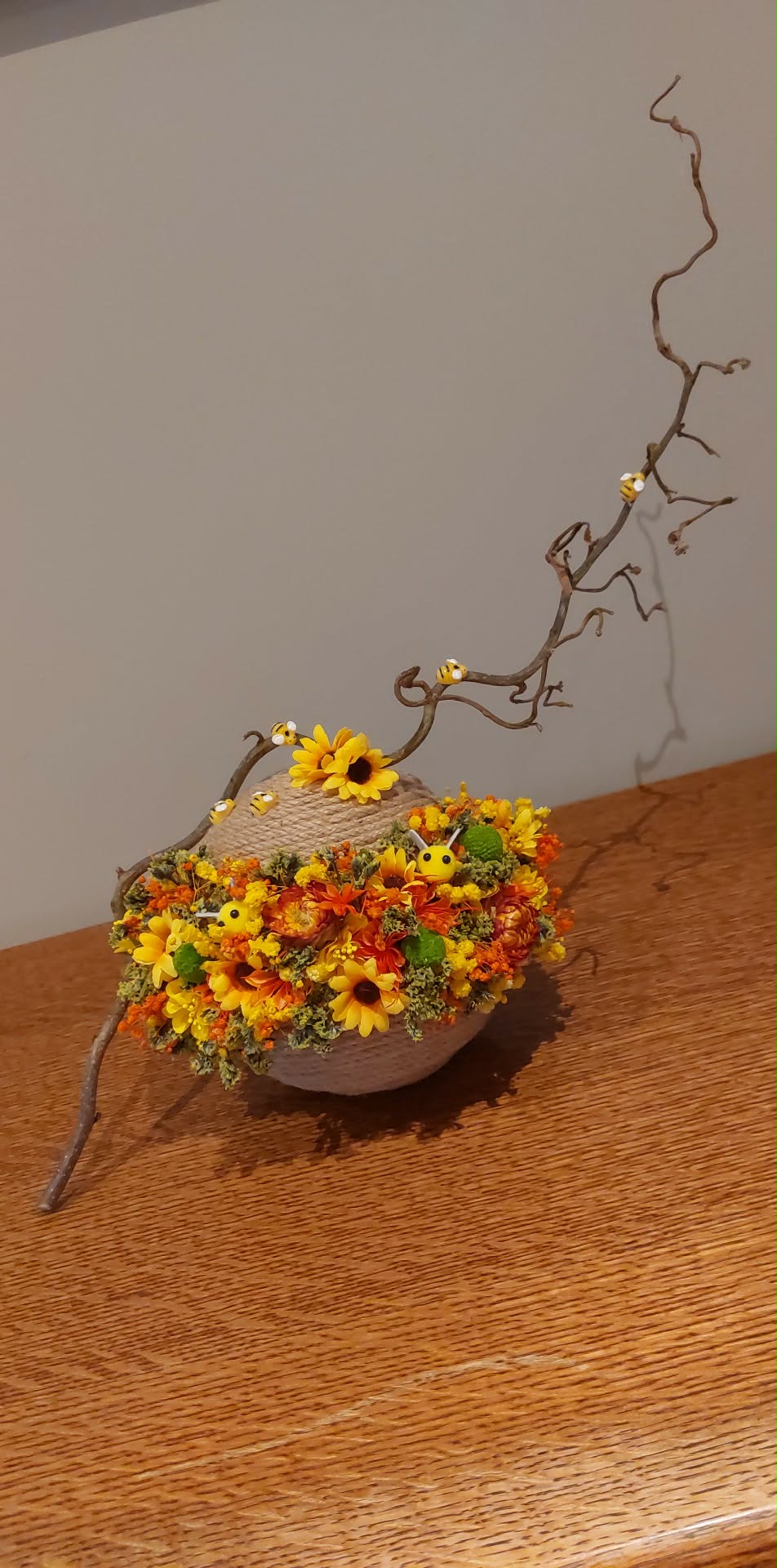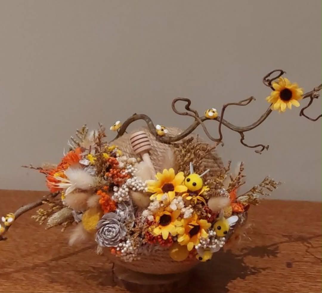 We maken zelf een bijenkorf. We vullen de korf met kunstbloemen en natuurlijk materiaal dat je zelf mag uitkiezen naar keuze.